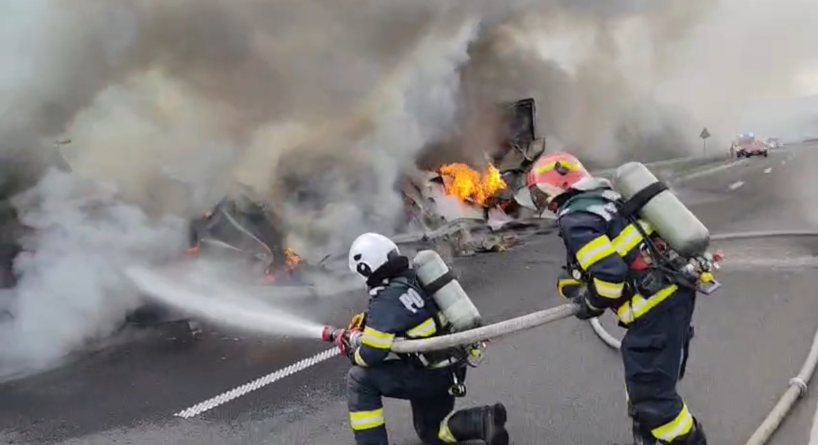 Pompierii Detașamentului Deva intervin în aceste momente pe autostrada A1, sens de mers Deva – Timișoara, unde un autocamion care transporta fructe, a fost cuprins de flăcări.