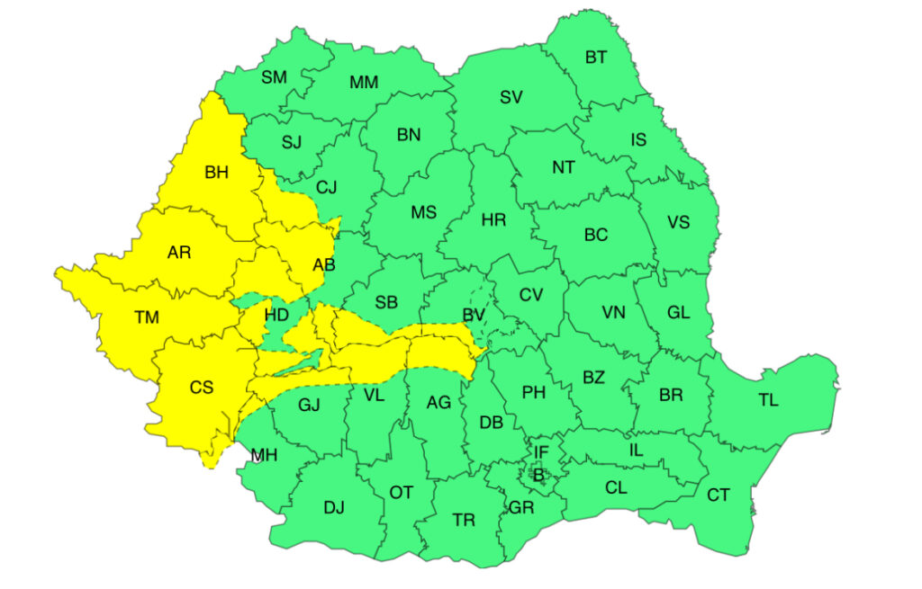 În perioada 23 octombrie, de la ora 21:00, până în 24 octombrie, ora 10:00, intră în vigoare un cod galben care vizează intensificări ale vântului în județele CS, TM, AR, BH și zona de munte din județul HD. Viteza vântului poate atinge între 70 și 90 km / h.