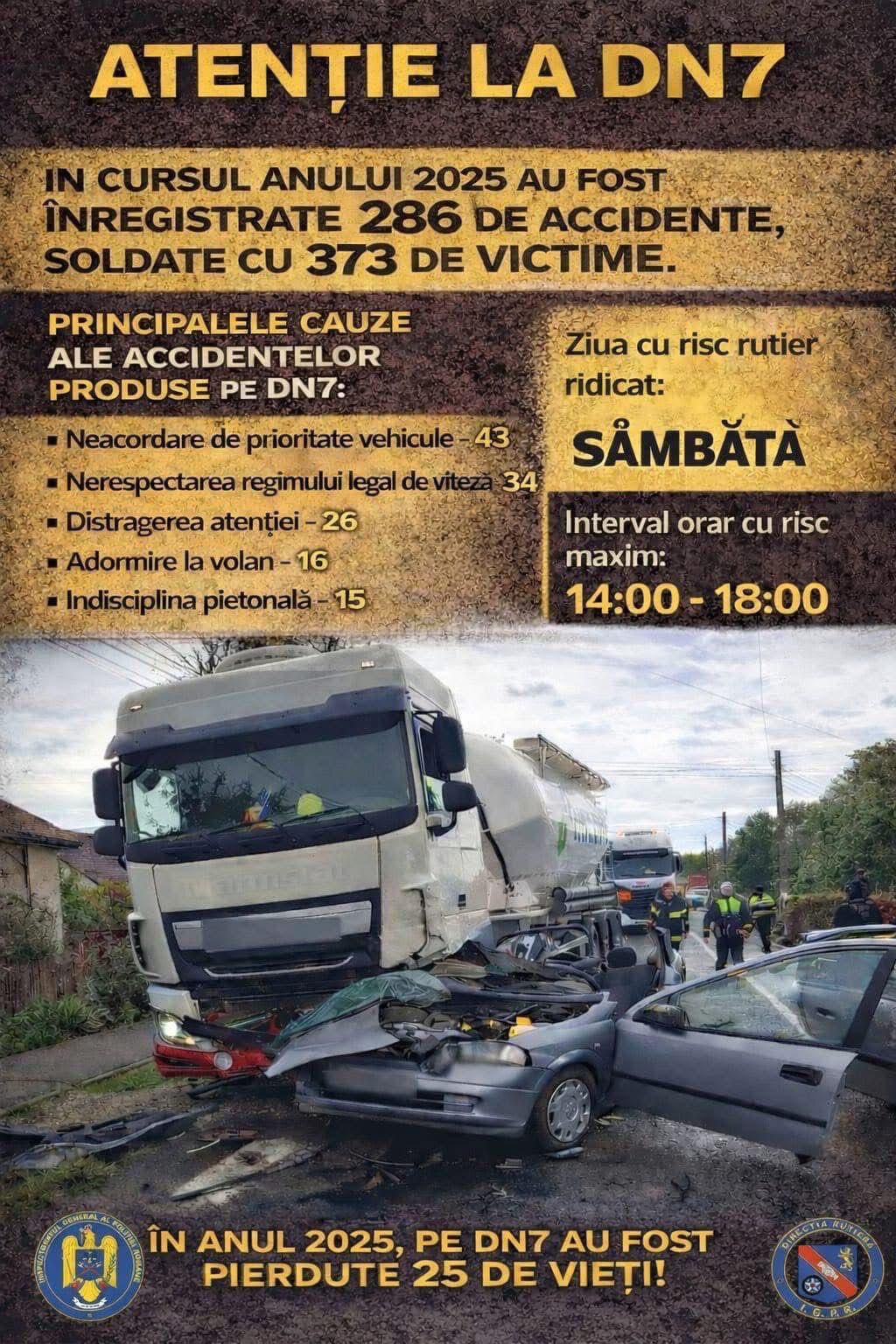 Intervenția vine după un bilanț îngrijorător: doar în 2025, pe DN7 au fost înregistrate 286 de accidente, cu 373 de victime, dintre care 25 și-au pierdut viața. Cele mai frecvente cauze sunt neacordarea de prioritate, viteza excesivă, neatenția la volan și chiar adormirea în timpul condusului.