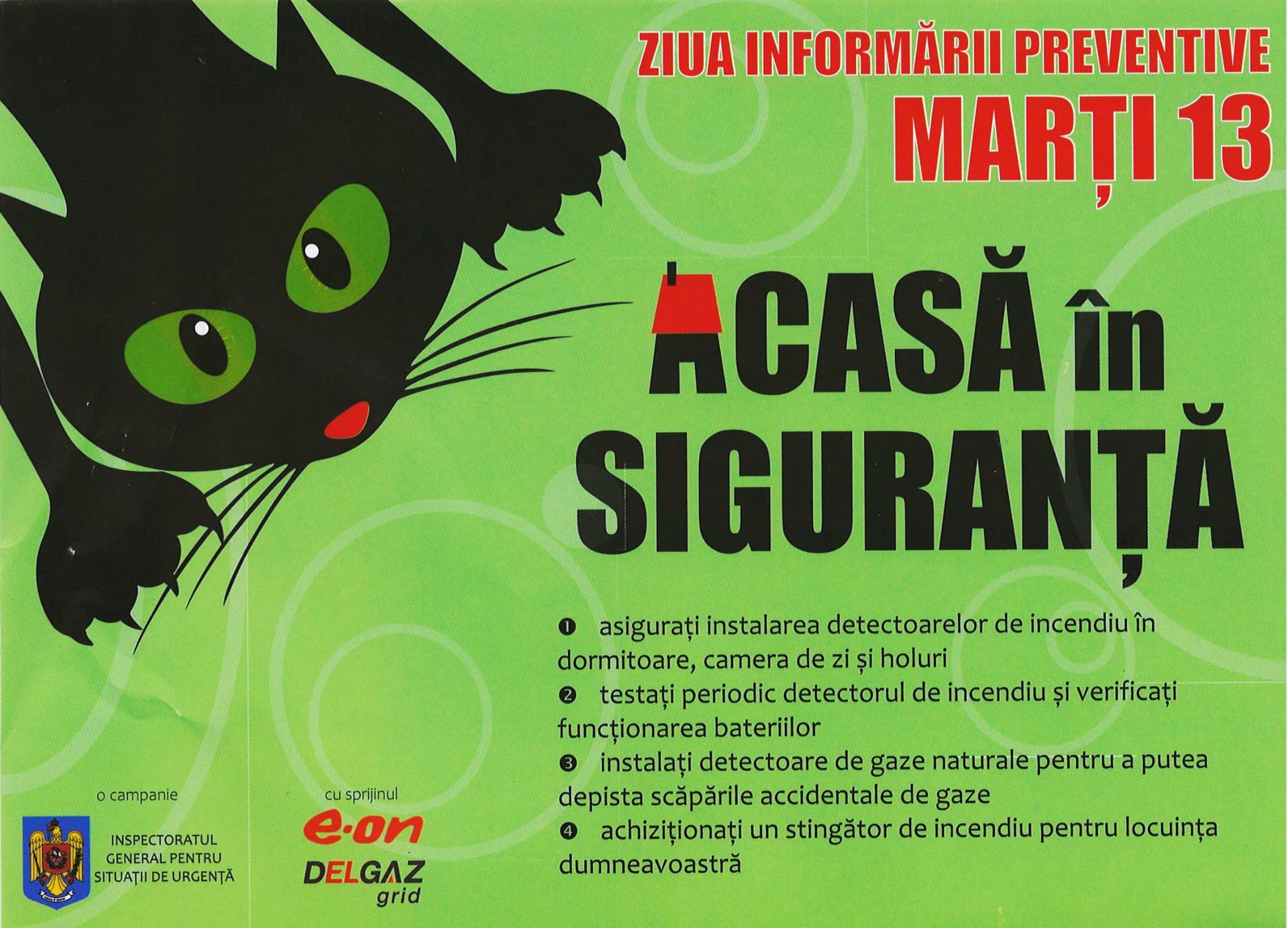 Desfășurate sub sloganul Preveniți ghinionul și având ca logo pisica neagră, activităţile informativ-educative urmăresc conştientizarea cetăţenilor asupra pericolelor la care se pot expune, în cazul nerespectării măsurilor şi regulilor de comportare specifice tipurilor de situaţii de urgenţă.