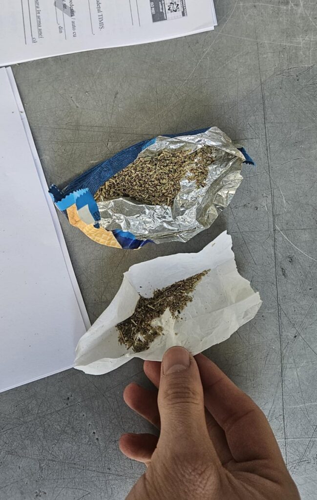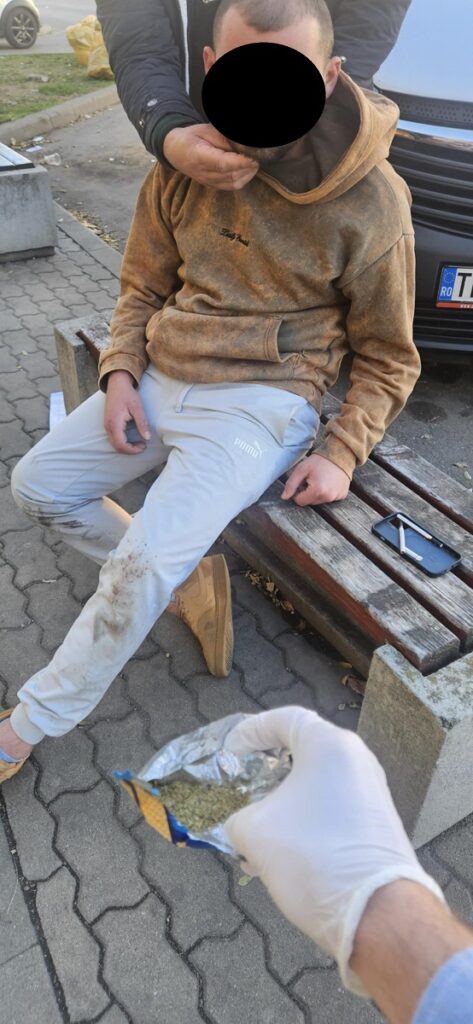 Polițiștii locali din cadrul Serviciului Siguranță și Ordine Publică, aflați în patrulare pe raza municipiului Timișoara, au observat în după-amiaza zilei de sâmbătă, în jurul orei 16.30,  pe Strada I. Văcărescu, o persoană care stătea rezemată de zilei unei clădiri și părea că nu se simte bine. Imediat s-au trecut la legitimarea acesteia, stabilindu-se că este vorba despre un tânăr de 28 de ani din localitatea Târnăveni, județul Mureș. În urma efectuării controlului corporal asupra sa, conform prevederilor legale, s-a constatat că avea în buzunare două plicuri cu substanțe vegetale de culoare verde olive, susceptibile a face parte din categoria celor interzise.