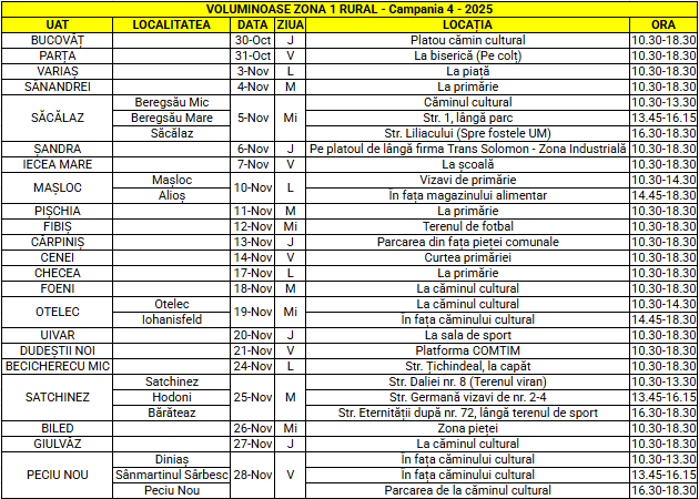 În perioada 30 octombrie – 28 noiembrie, în Zona 1 Rural, Timiș, RETIM Ecologic Service S.A. împreună cu ADID Timiș, organizează ultima campanie de predare gratuită a deșeurilor voluminoase din 2025 în Bucovăț, Parța, Variaș, Sânandrei, Săcălaz (și în Beregsău Mic și Beregsău Mare), Șandra, Iecea Mare, Mașloc (și în Alioș), Pișchia, Fibiș, Cărpiniș, Cenei, Checea, Foeni, Otelec (și în Iohanisfeld), Uivar, Dudeștii Noi, Becicherecu Mic, Satchinez (și în Hodoni și Bărăteaz), Biled, Giulvăz și Peciu Nou (și în Diniaș și Sânmartinul Sârbesc).