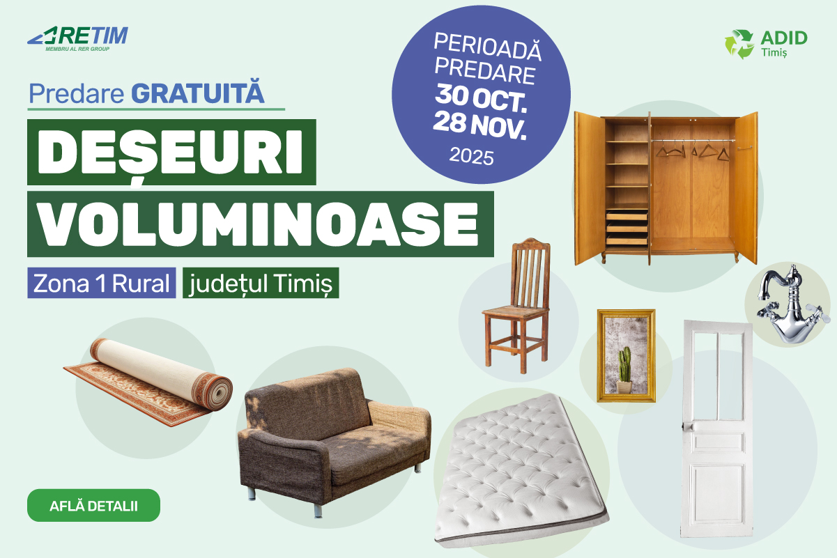 În perioada 30 octombrie – 28 noiembrie, în Zona 1 Rural, Timiș, RETIM Ecologic Service S.A. împreună cu ADID Timiș, organizează ultima campanie de predare gratuită a deșeurilor voluminoase din 2025 în Bucovăț, Parța, Variaș, Sânandrei, Săcălaz (și în Beregsău Mic și Beregsău Mare), Șandra, Iecea Mare, Mașloc (și în Alioș), Pișchia, Fibiș, Cărpiniș, Cenei, Checea, Foeni, Otelec (și în Iohanisfeld), Uivar, Dudeștii Noi, Becicherecu Mic, Satchinez (și în Hodoni și Bărăteaz), Biled, Giulvăz și Peciu Nou (și în Diniaș și Sânmartinul Sârbesc).