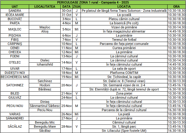 Depozitarea deșeurilor periculoase din menajer în locuri neautorizate poate avea un impact negativ asupra mediului! În perioada 30 octombrie – 28 noiembrie, în Zona 1 Rural, Timiș localitățile Șandra, Iecea Mare, Bucovăț, Parța, Mașloc (și în Alioș), Pișchia, Fibiș, Cărpiniș, Cenei, Checea, Foeni, Otelec (și în Iohanisfeld), Uivar, Dudeștii Noi, Becicherecu Mic, Satchinez (și în Hodoni și Bărăteaz), Biled, Giulvăz, Peciu Nou (și în Diniaș și Sânmartinul Sârbesc), Variaș, Sânandrei și Săcălaz (și în Beregsău Mic și Beregsău Mare), RETIM și ADID Timiș organizează a patra campanie de predare gratuită a deșeurilor periculoase din menajer din 2025.