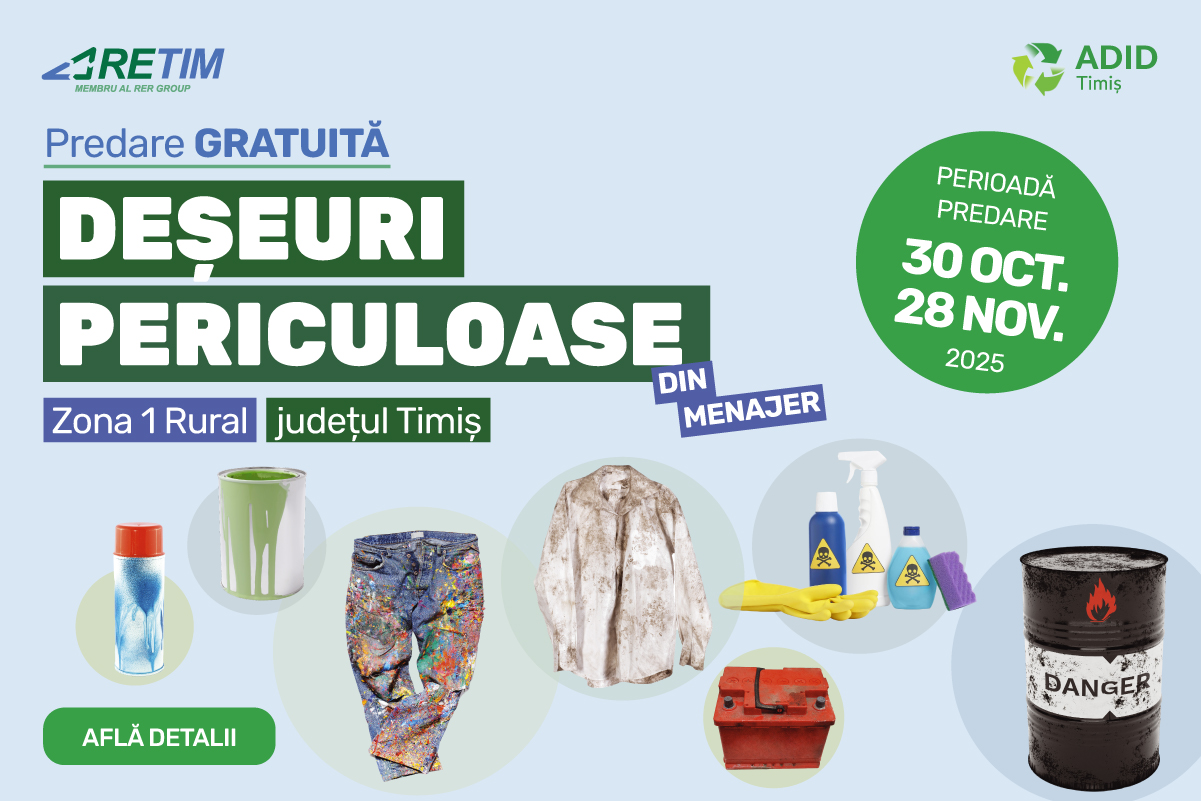 Depozitarea deșeurilor periculoase din menajer în locuri neautorizate poate avea un impact negativ asupra mediului! În perioada 30 octombrie – 28 noiembrie, în Zona 1 Rural, Timiș localitățile Șandra, Iecea Mare, Bucovăț, Parța, Mașloc (și în Alioș), Pișchia, Fibiș, Cărpiniș, Cenei, Checea, Foeni, Otelec (și în Iohanisfeld), Uivar, Dudeștii Noi, Becicherecu Mic, Satchinez (și în Hodoni și Bărăteaz), Biled, Giulvăz, Peciu Nou (și în Diniaș și Sânmartinul Sârbesc), Variaș, Sânandrei și Săcălaz (și în Beregsău Mic și Beregsău Mare), RETIM și ADID Timiș organizează a patra campanie de predare gratuită a deșeurilor periculoase din menajer din 2025.
