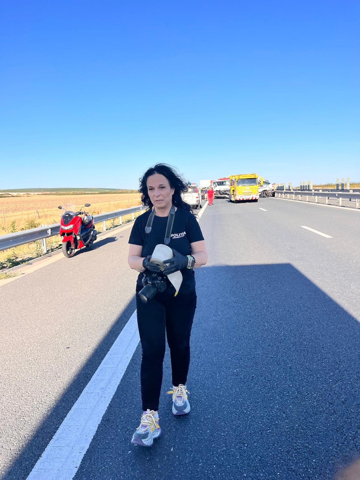 Polițista a oprit și i-a acordat primul ajutor, constatând că femeia prezenta o rană tăiată la mâna dreaptă, posibil provocată în timpul demontării unor elemente reflectorizante („ochi de pisică”) de pe balustrada metalică.