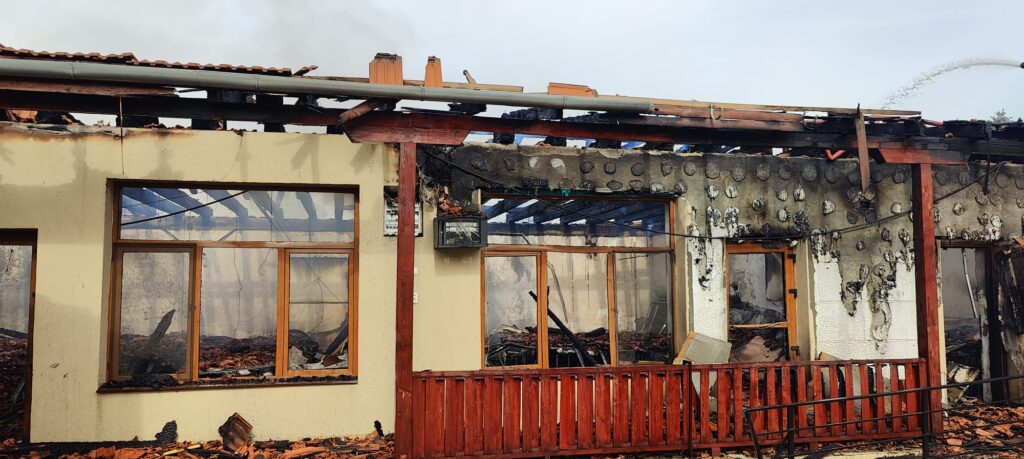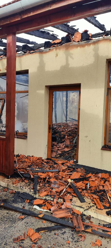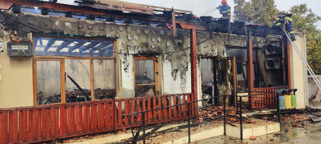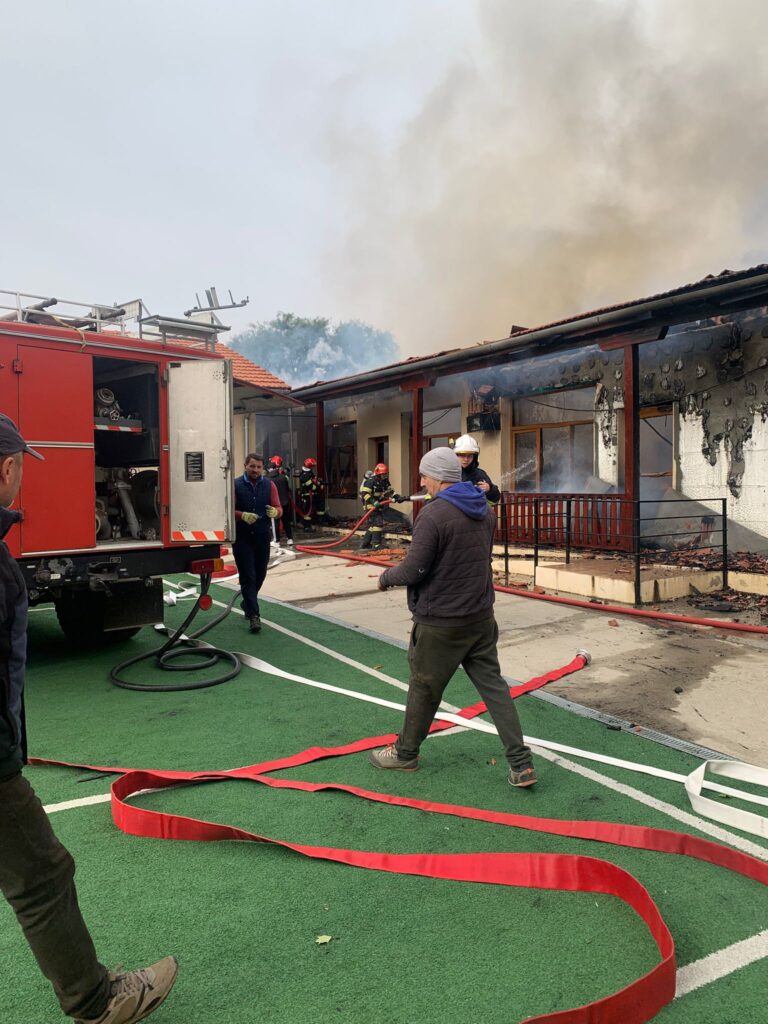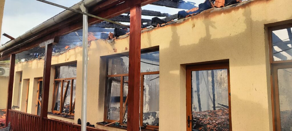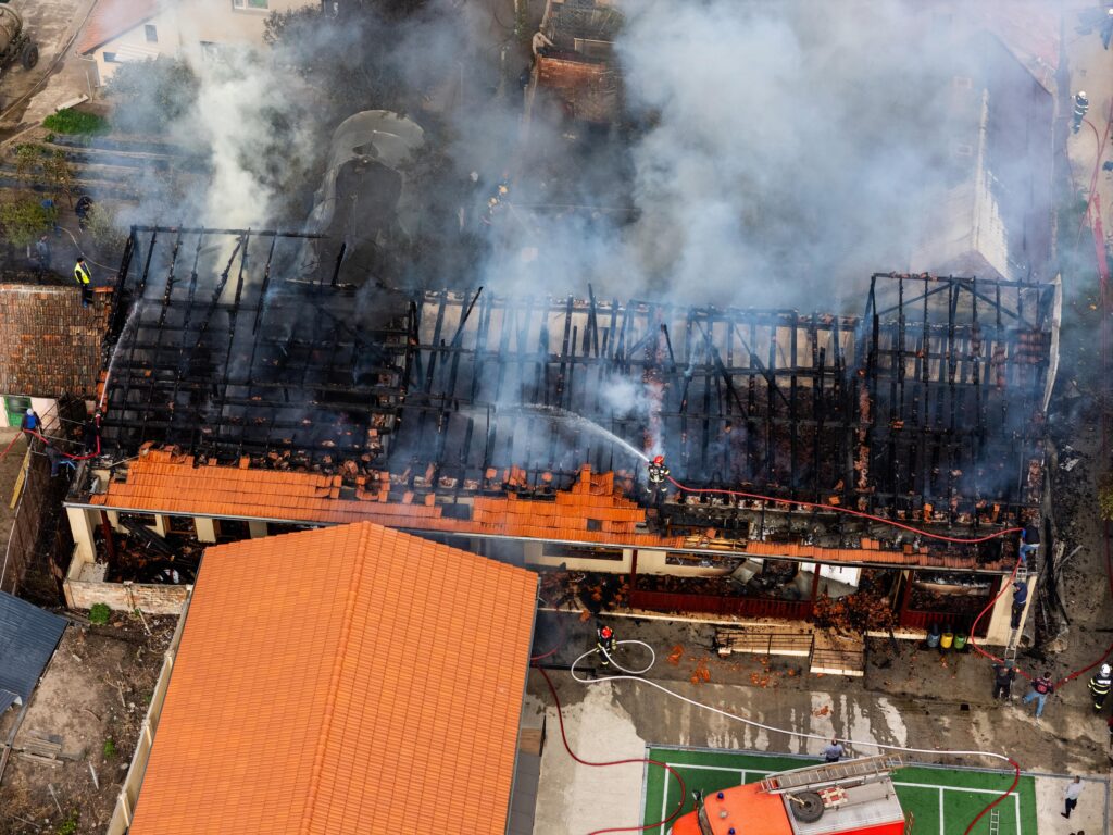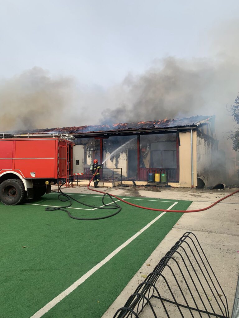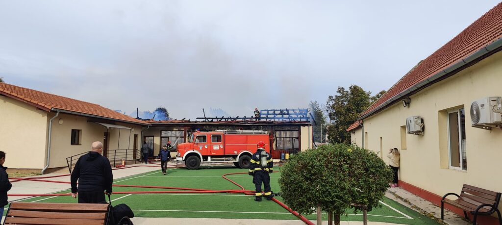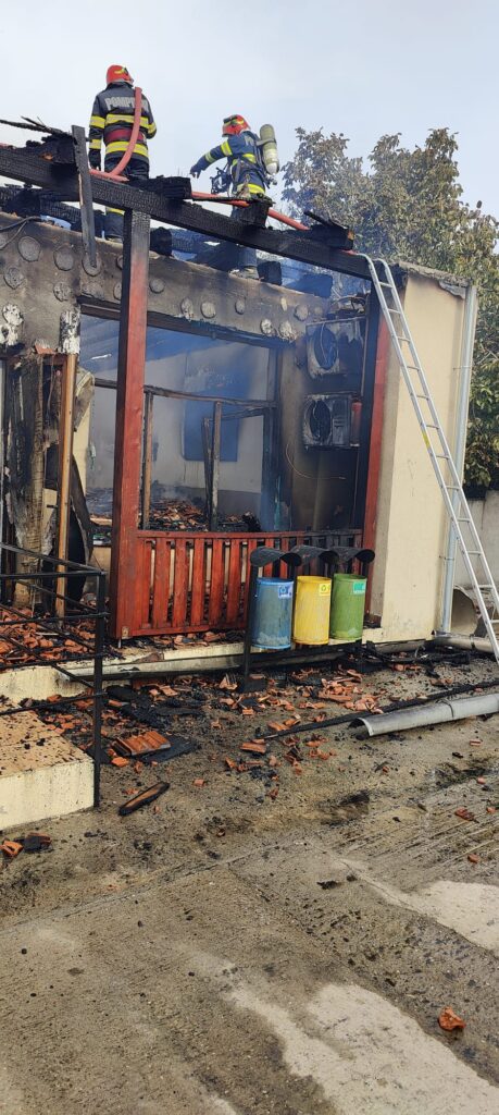 UPDATE 1: Aproximativ 80 de persoane s-au autoevacuat în siguranță. Incendiul este localizat; se manifestă cu ardere generalizată la acoperișul clădirii și al casei învecinate, pe o suprafață de aproximativ 400 mp.