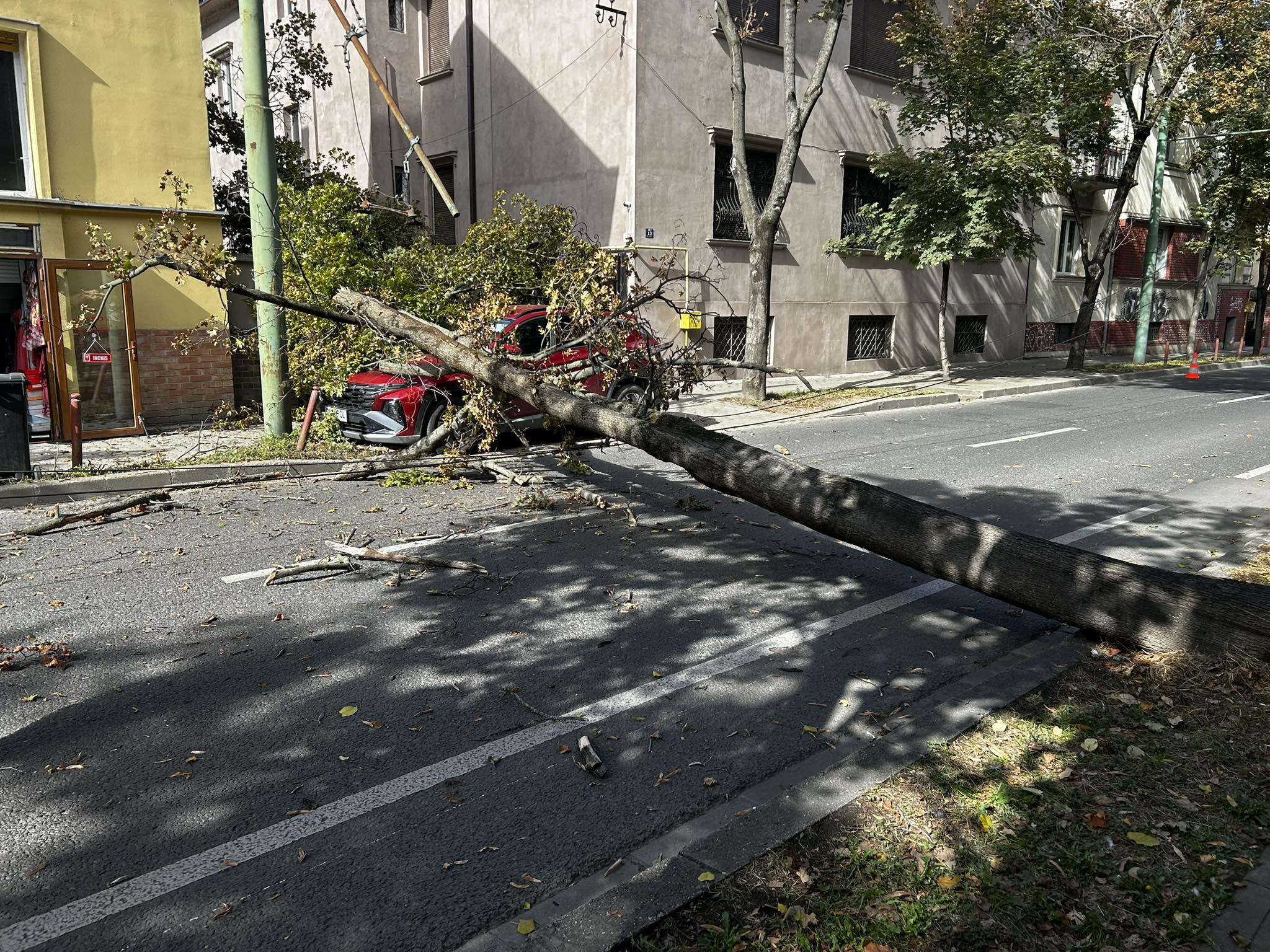 Un copac s-a prăbușit, azi, din cauza vântului puternic, peste o mașină parcată pe strada Paris din centrul Timișoarei.