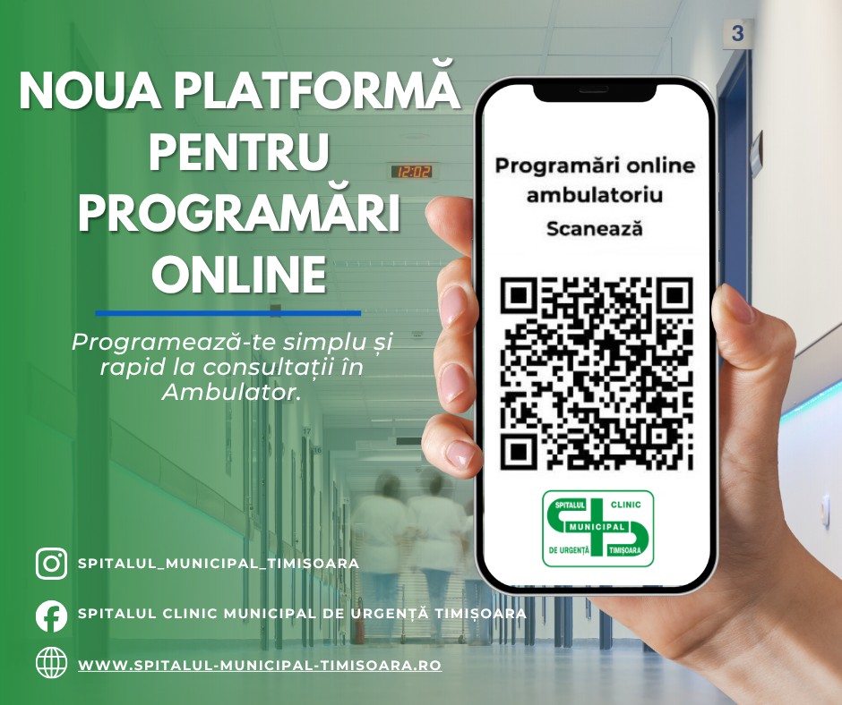 Programările se pot face online, direct pe site: www.spitalul-municipal-timisoara.ro, Secțiunea Informații pacienți/Programări ambulatoriu, accesând Portal Programări Onlinesau scanând codul QR.