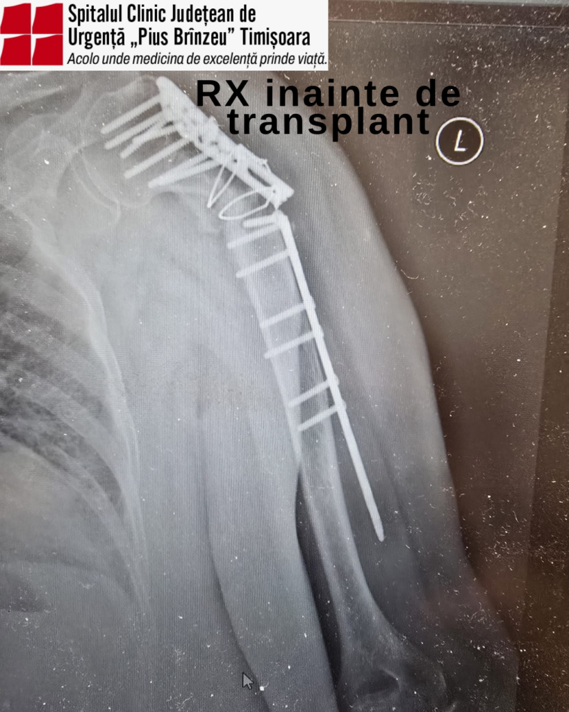 Prima intervenție realizată în acest context a vizat un caz deosebit de complex: o fractură iterativă de humerus proximal, asociată cu defect osos major și degradarea materialului de osteosinteză utilizat într-o intervenție anterioară. Din cauza dificultății cazului, echipa medicală a optat pentru o soluție terapeutică avansată, menită să ofere pacientei cele mai bune șanse de recuperare funcțională.